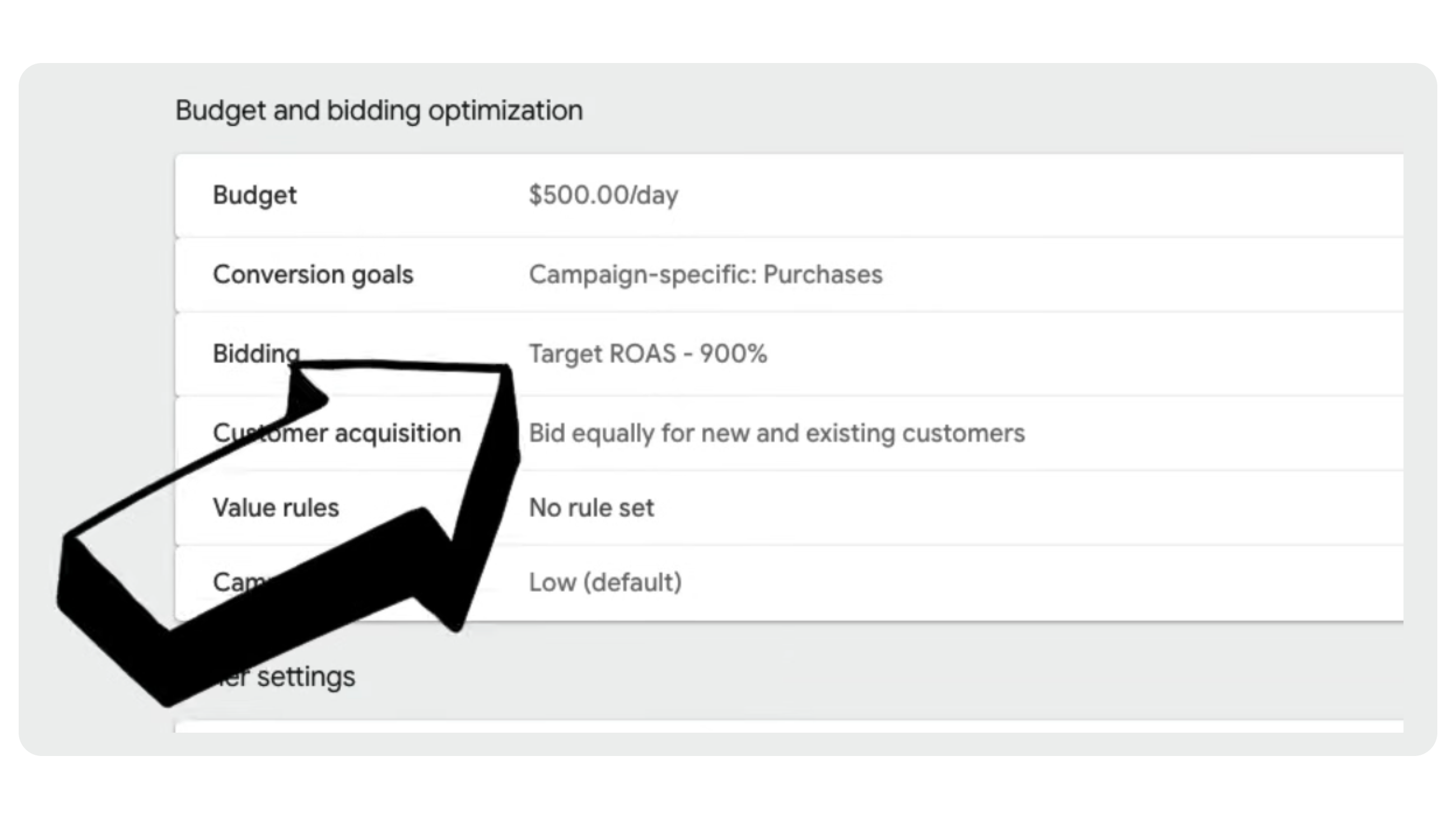 Here’s a real example. A Shopping campaign had a daily budget of $500 but spent only $100–$200 a day. The bid strategy was tROAS — set to 900%. The campaign was hitting around 900%.