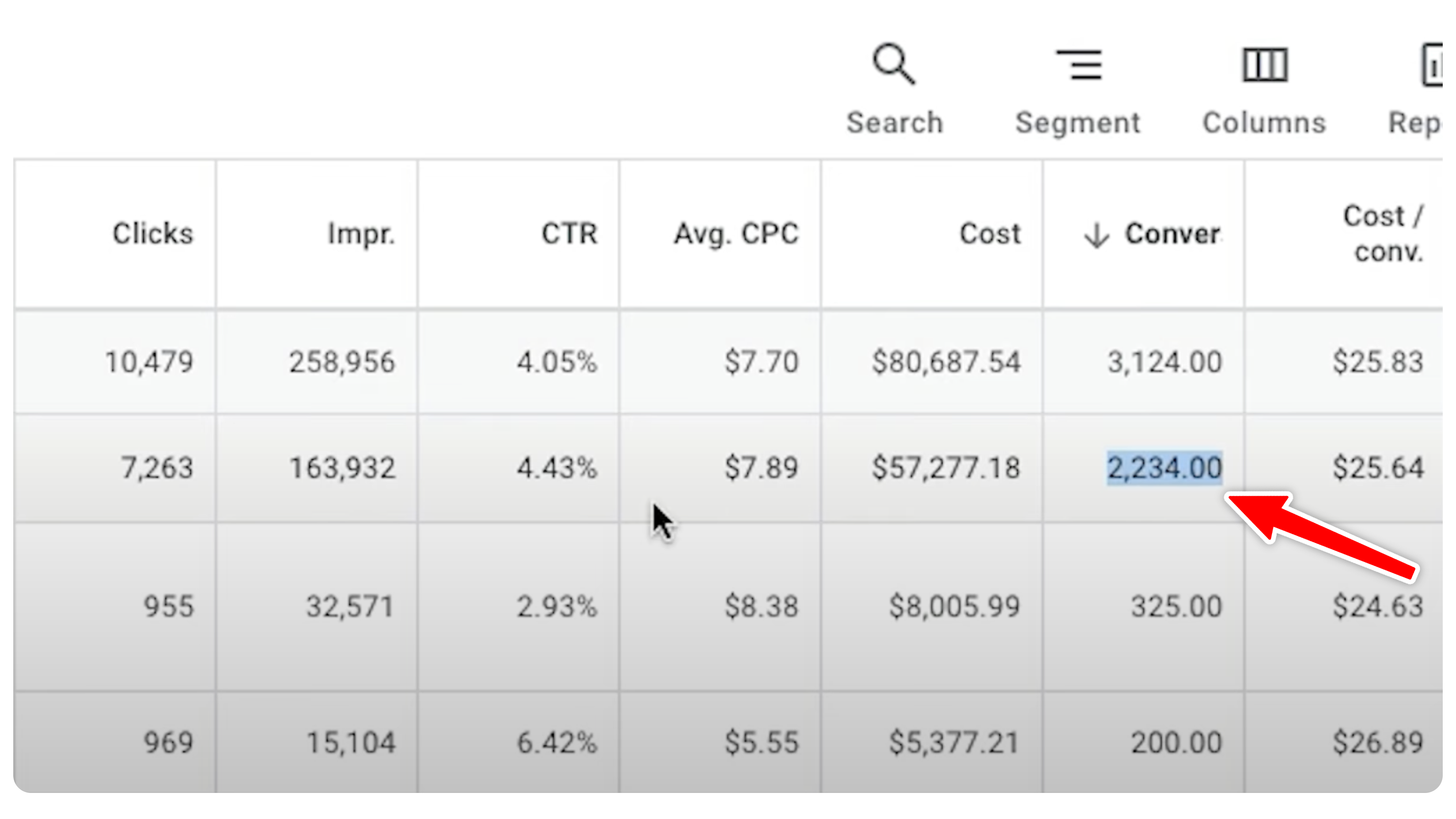 One ad group in a manager account spent over $80,000 in one month. It had 55 keywords — way more than necessary for effective ad group management. But here’s the problem: out of 3,124 conversions, 2,234 came from one keyword.