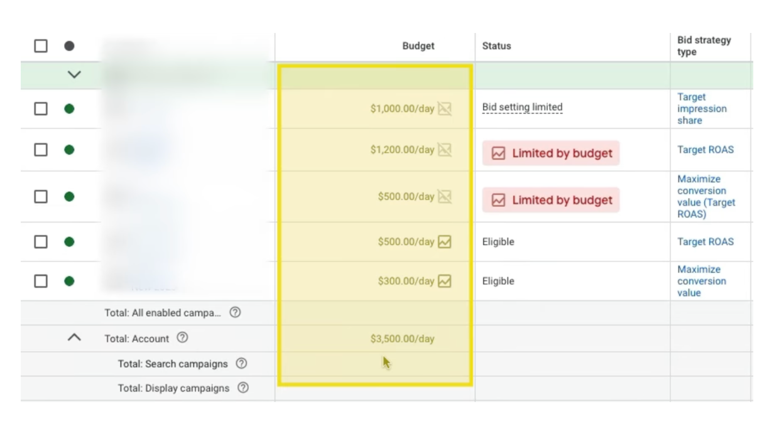 - Status – This tells you if there are any issues affecting your campaign’s performance. “Limited by budget” is a big one. If you’re profitable and seeing this, you’re leaving money on the table.